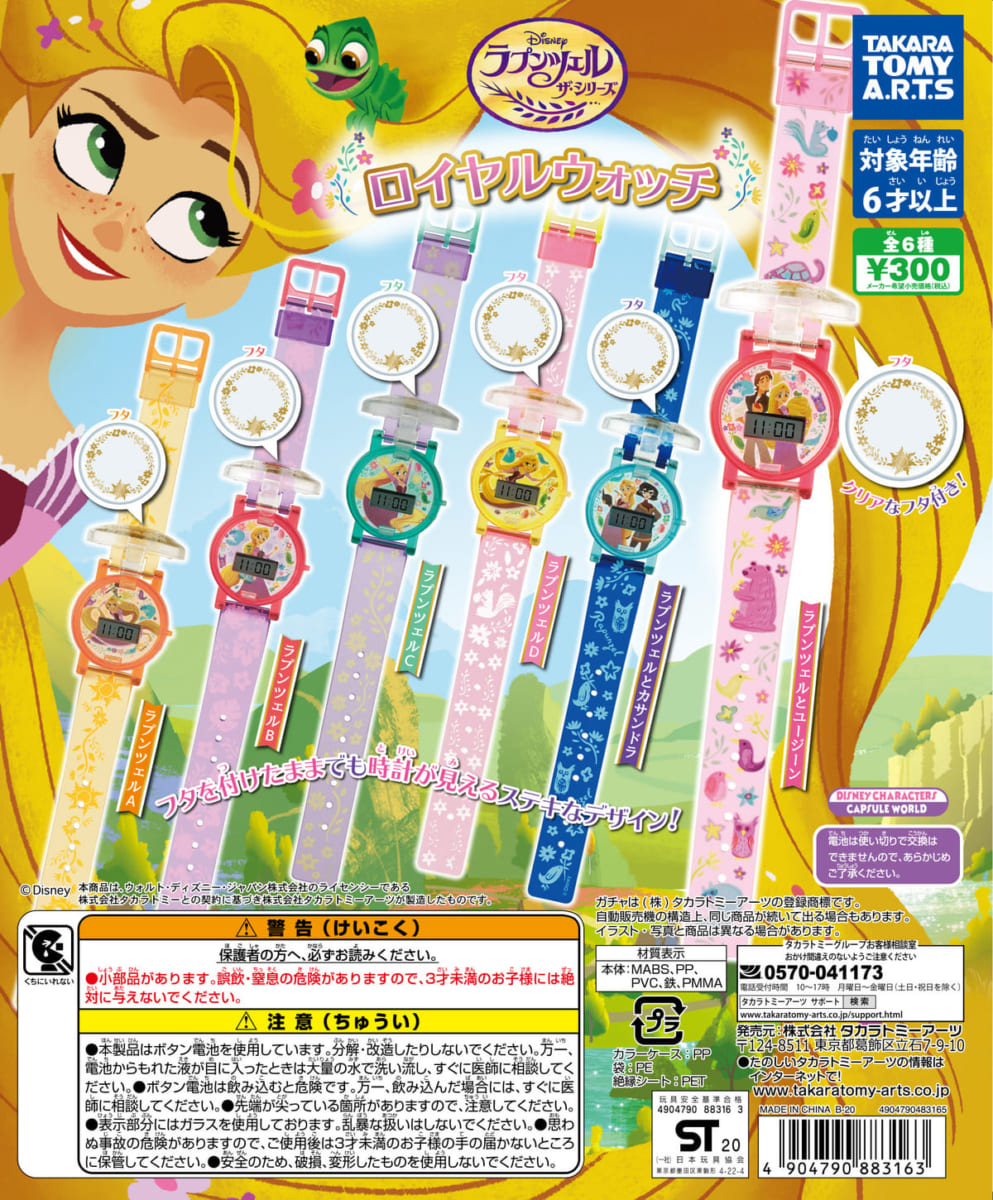 「ラプンツェル」はもちろん、「ユージーン」や「カサンドラ」もデザインされた腕時計は全6種類がラインナップし、カプセルトイ販売機で発売中です。