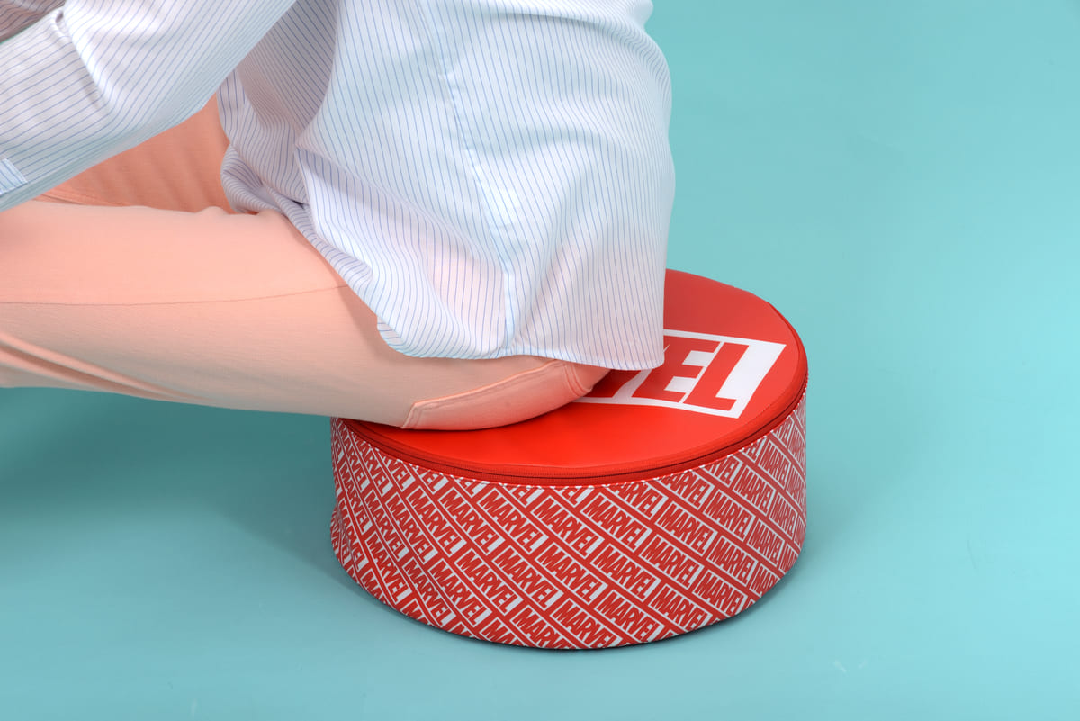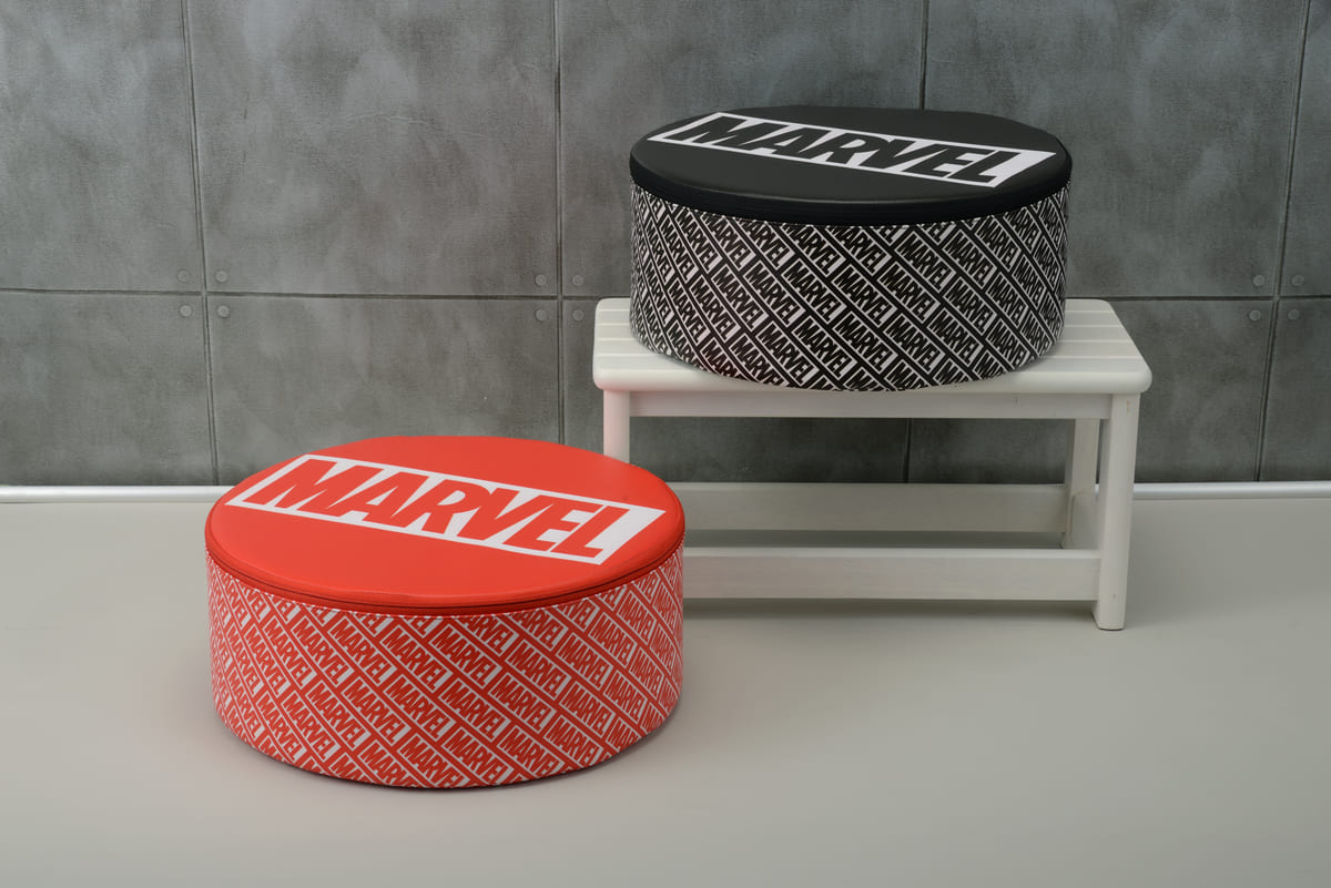 全長約35センチで設計された、存在感抜群なスツールのサイドには「MARVEL」のボックスが総柄でプリントされています。