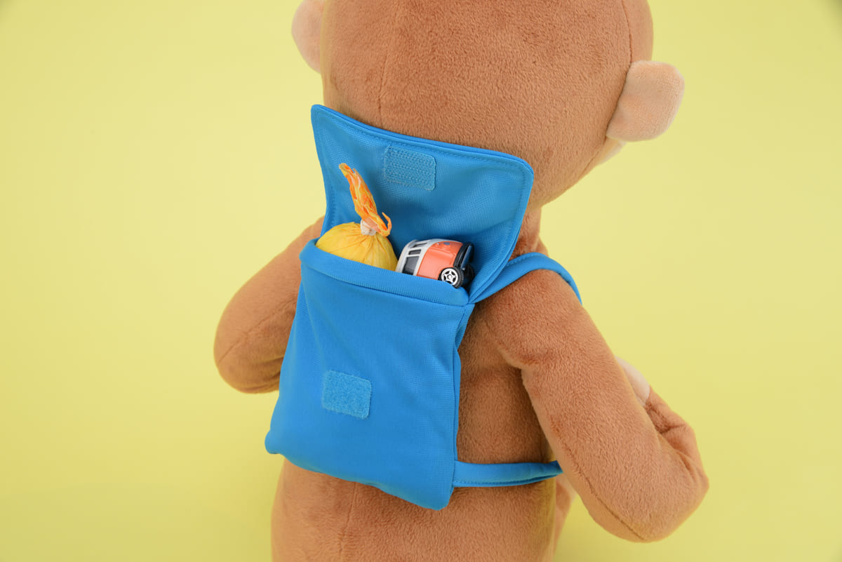 「ジョージ」が背負っているリュックにはお気に入りの小物を入れることも可能。