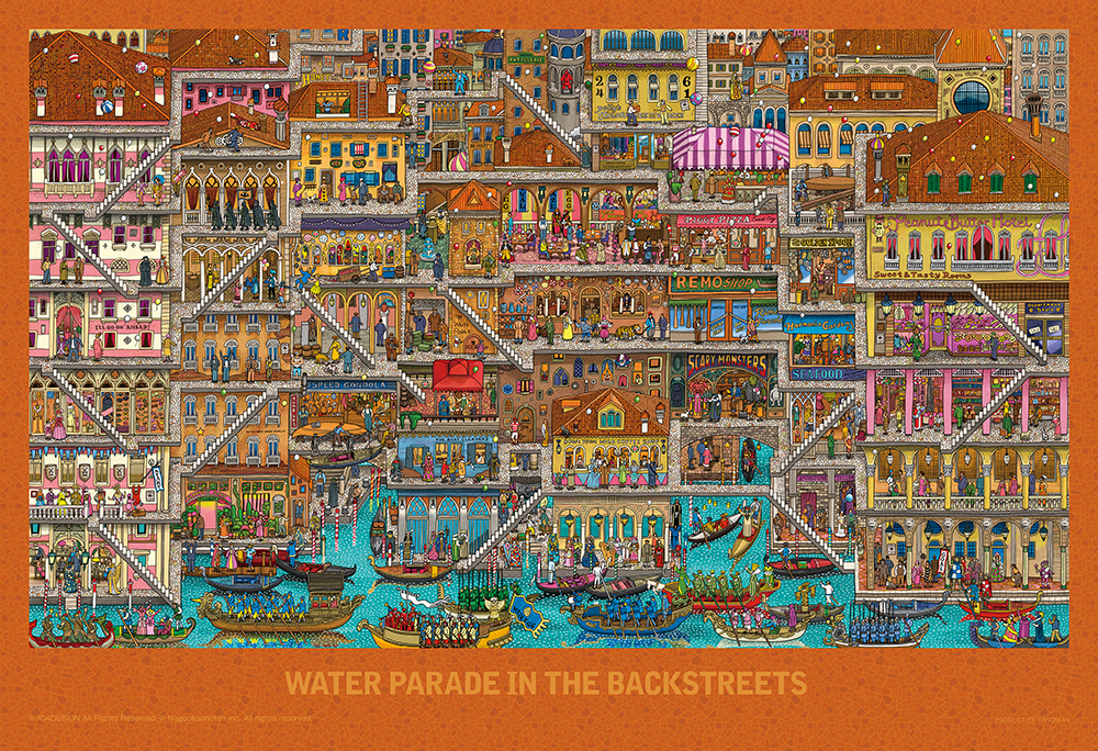 しましま屋敷の裏通りにて繰り広げられているゴンドラのパレードを描いた迷路パズルです。