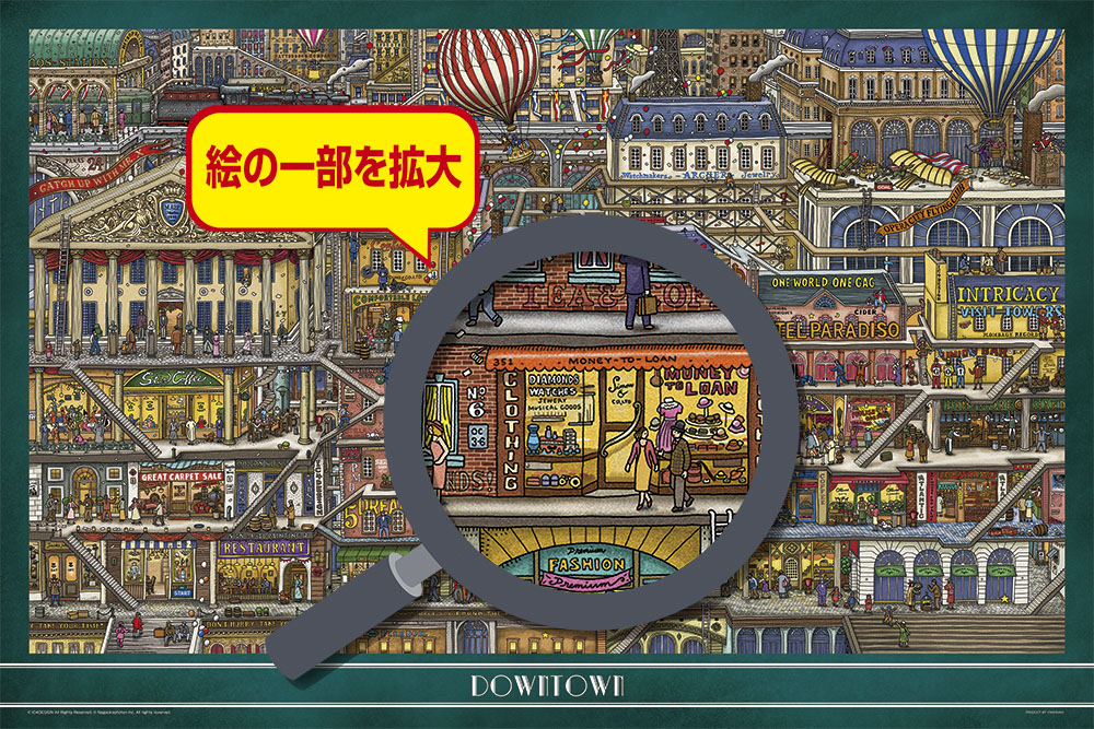 「迷路探偵ピエール」シリーズならではの雄大な景観の中に建物や人々が細かく描かれたアートを使用した迷路パズル。