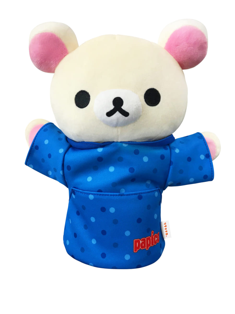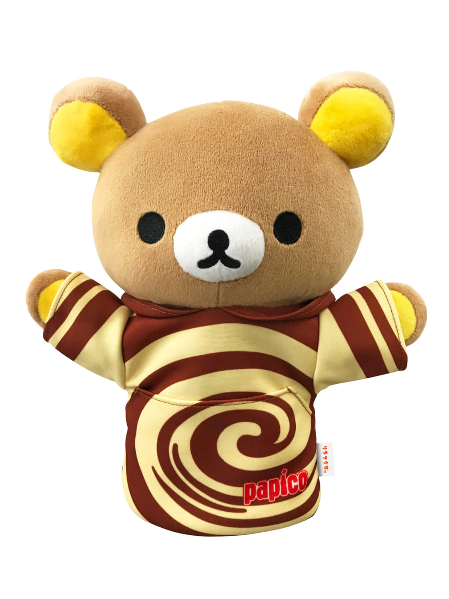 「リラックマ」のパペットは、おなじみの「チョココーヒー」のパッケージデザインをイメージした服を着ています。