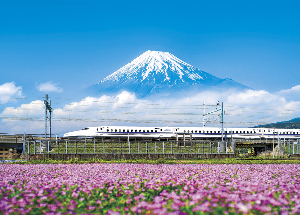 山頂にまだ雪を残した白富士を背景に、走り抜ける新幹線N700系を画角に収めた一作です。