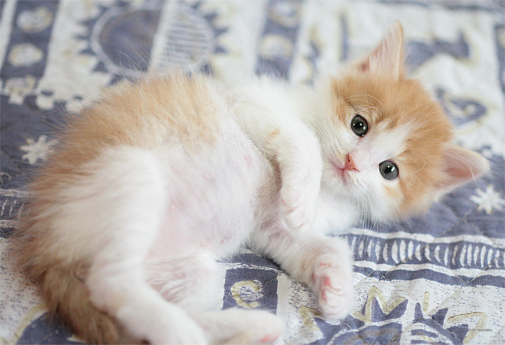 ころんと転がって、おなかを見せてくれているマンチカンの子猫。