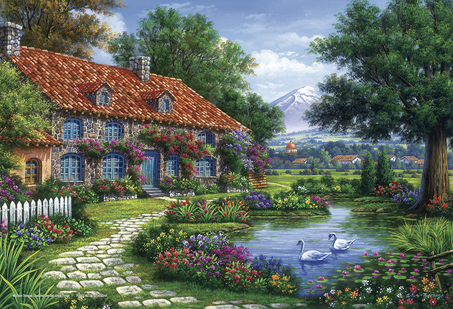 「ラスティック・コテージ・ウィズ・スワンズ」デザインのジグソーパズル。