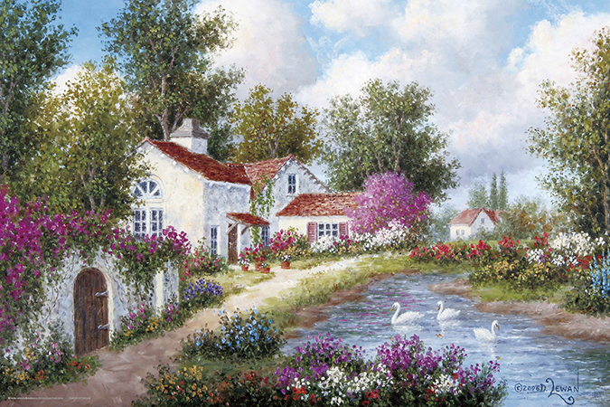 のどかな田舎のコテージと白鳥を描いた作品。