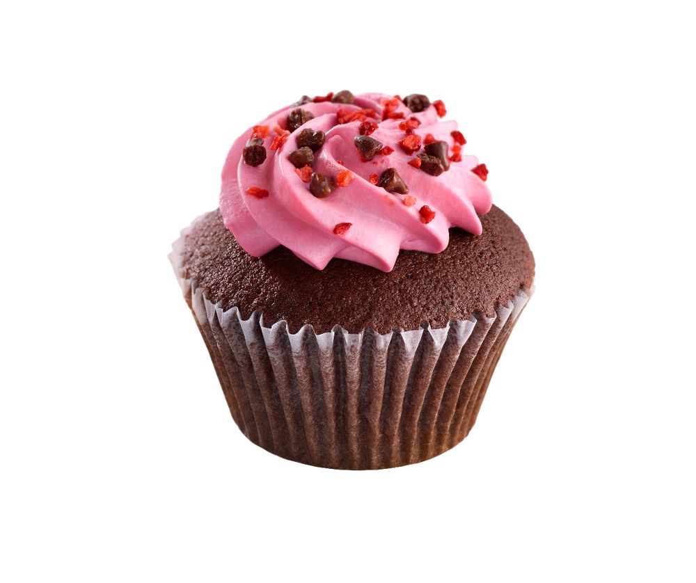 ココアのほろ苦さを感じるしっとりしたカップケーキに、フランボワーズの甘酸っぱいクリームをデコレーションした「ラズベリー&チョコカップケーキ」