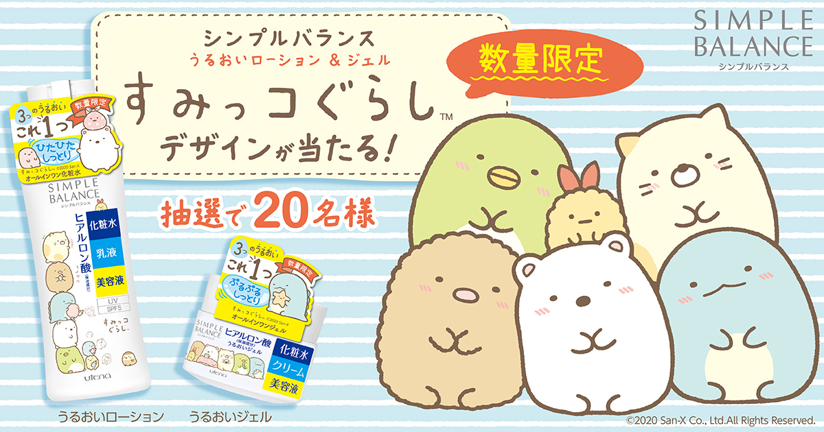 ウテナのオールインワンスキンケアシリーズ「シンプルバランス」に、数量限定で「すみっコぐらし」デザインの「うるおいローション」と「うるおいジェル」が2020年4月20日(月)に登場します。