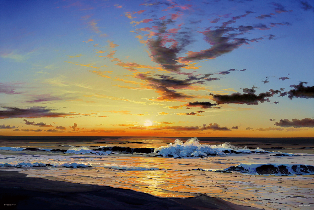 水平線から朝日が昇る海岸の風景が描かれています。