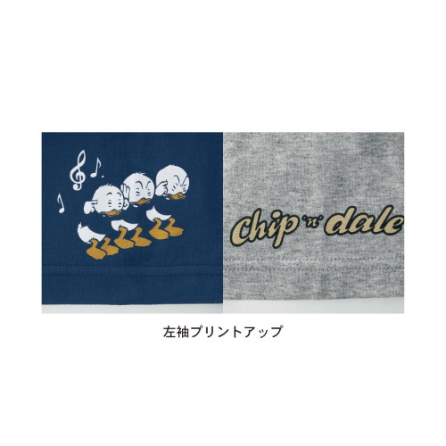 ポケットには、大好物の木の実で遊ぶ「チップ」と「デール」の楽しそうな姿が、袖にはロゴがプリントされています。