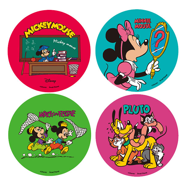 本や教鞭に囲まれた「ミッキーマウス」に、手鏡を持った「ミニーマウス」、そして「ミッキー」の甥っ子の「モーティー」と「フェルディ」、猫たちと戯れている「プルート」デザインや、