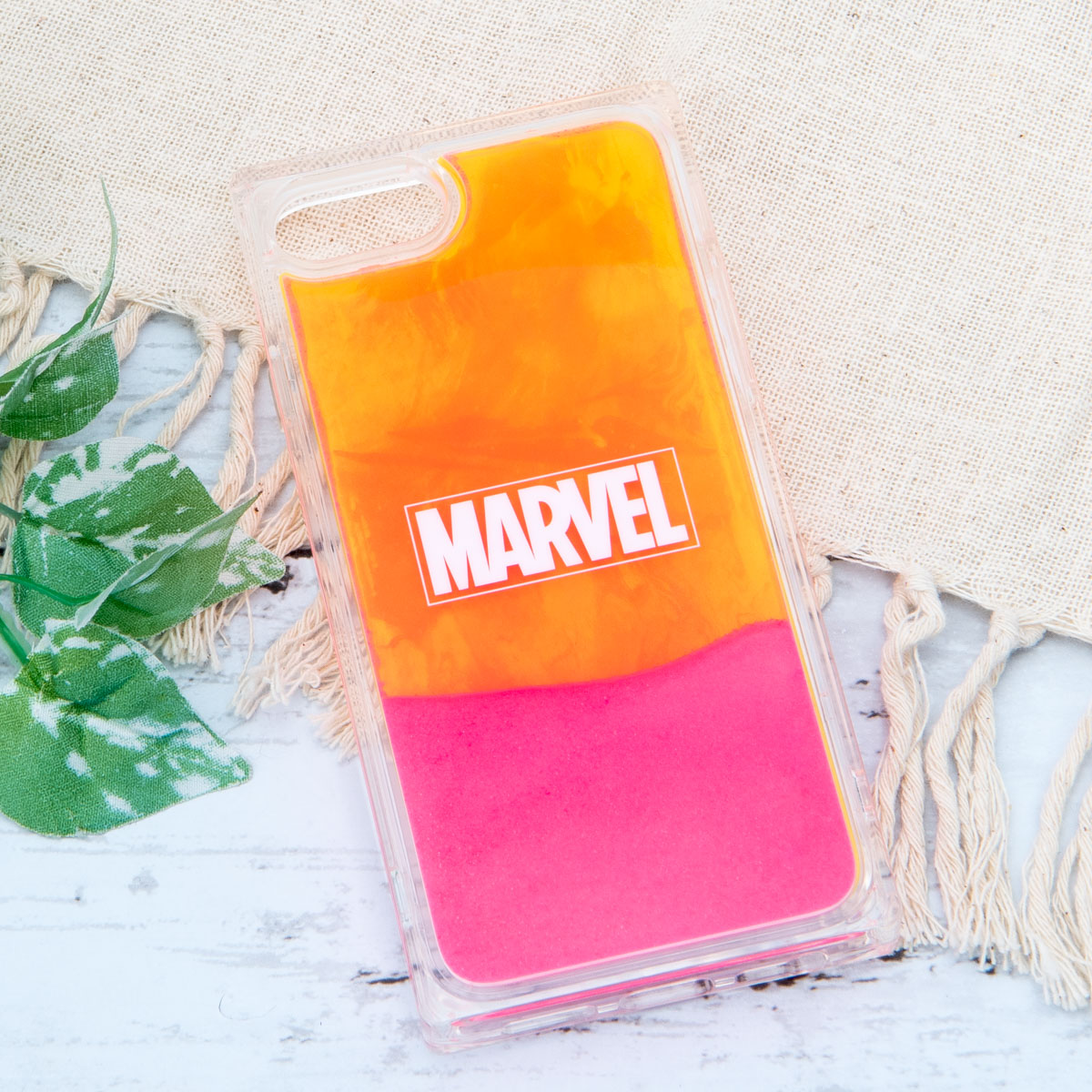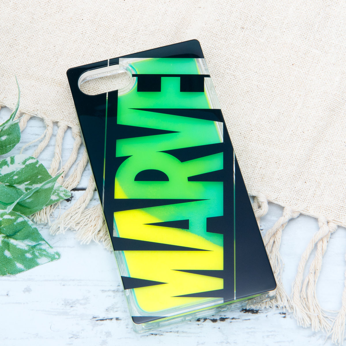 PGAから販売されている、「MARVEL」ボックスロゴデザインのiPhone用ネオンサンドケース。