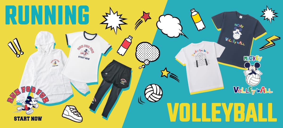 「ディズニー」2020春夏スポーツコレクションには、ランニング、バレーボールウェアとして最適なデザイングッズが豊富にラインナップ。