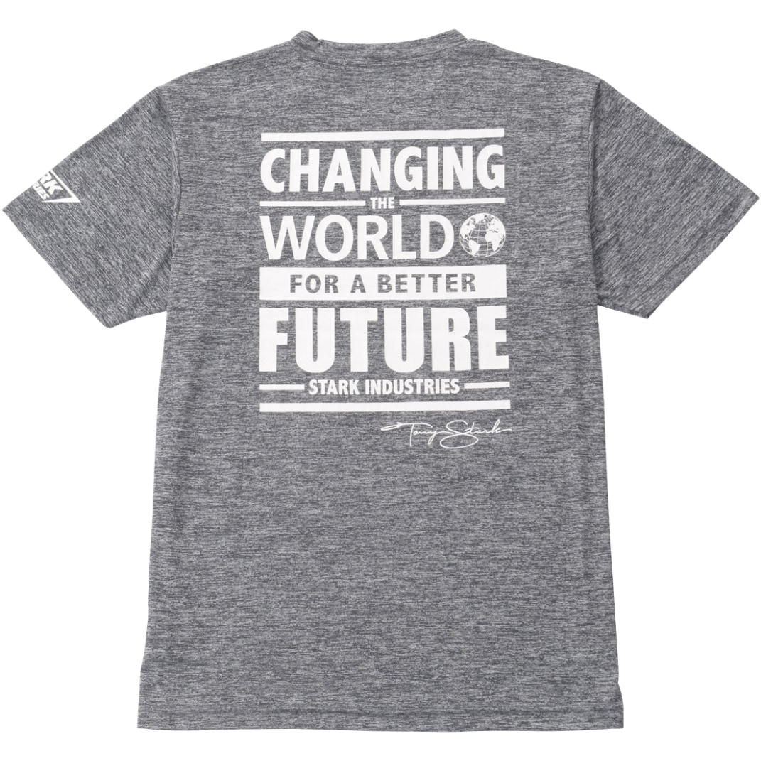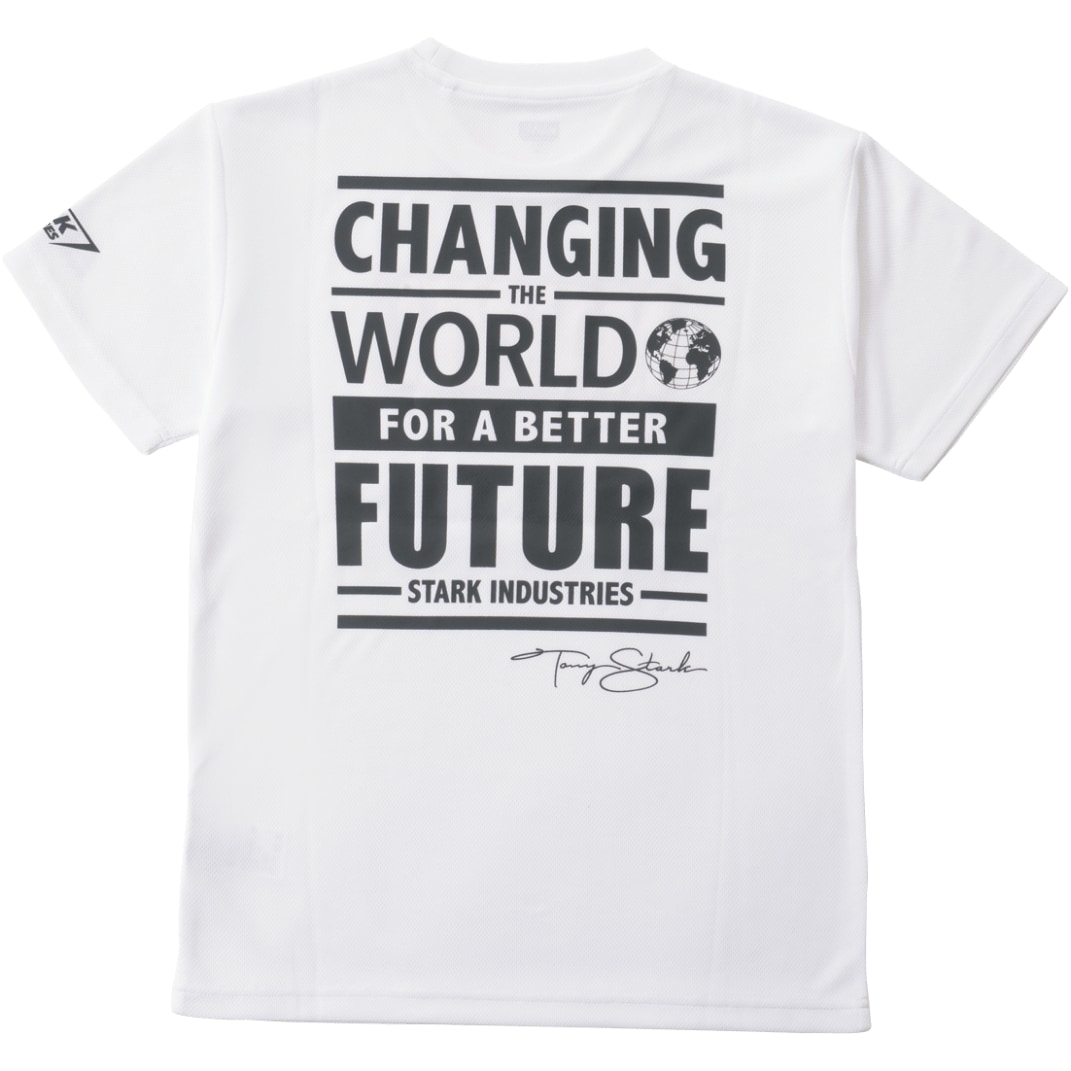 バックプリントには「スターク・インダストリーズ」の社訓「CHANGING THE WORLD FOR A BETTER FUTURE」のロゴ入り。