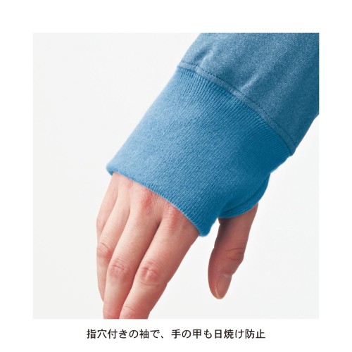 袖口は手の甲までカバーする長め丈で、親指を通せる指穴も付いています。