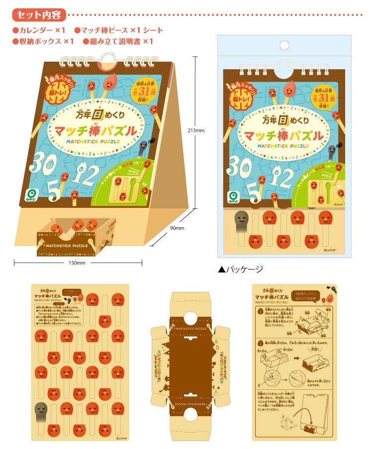 カレンダーにはマッチ棒形のピースを使って脳トレできる、図形・計算問題が31問収録されていて、1日1問挑戦していくと1ヶ月楽しむことができます☆