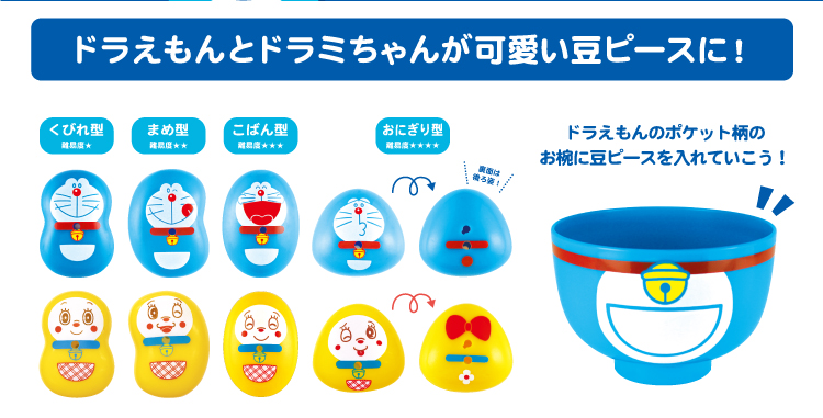 「ドラえもん」と「ドラミちゃん」のいろいろな表情が楽しい豆ピースで、豆つかみや仕分けゲームが楽しめます☆