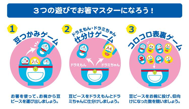 お箸を使ってお椀から豆ピースを運び出す「豆つかみゲーム」のほか、ドラえもんとドラミちゃんを仕分けるゲームや、豆ピースをお箸で投げて仰向けになった数を競う「コロコロ表裏ゲーム」などを楽しめ、遊びながらお箸のマナーを学べます☆