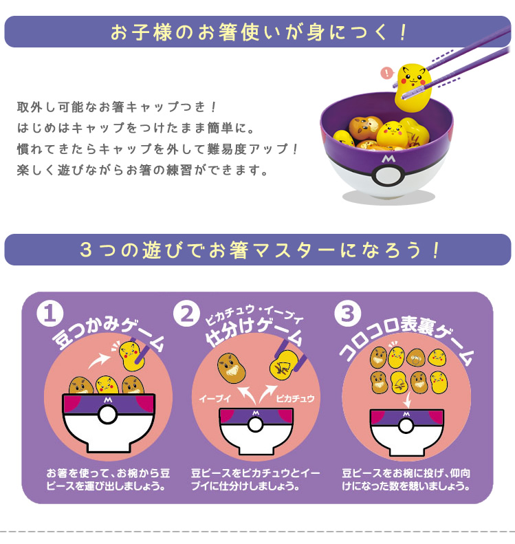 「豆つかみゲーム」のほか、「ピカチュウ豆」と「イーブイ豆」を仕分けるゲームや、交互にお箸で投げて表になった数を競う「コロコロ表裏ゲーム」など、3つのゲームで、遊びながらお箸のマナーを学べます。