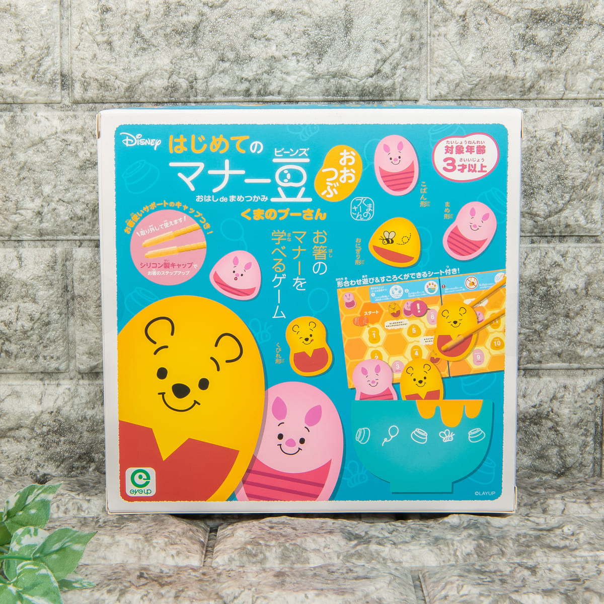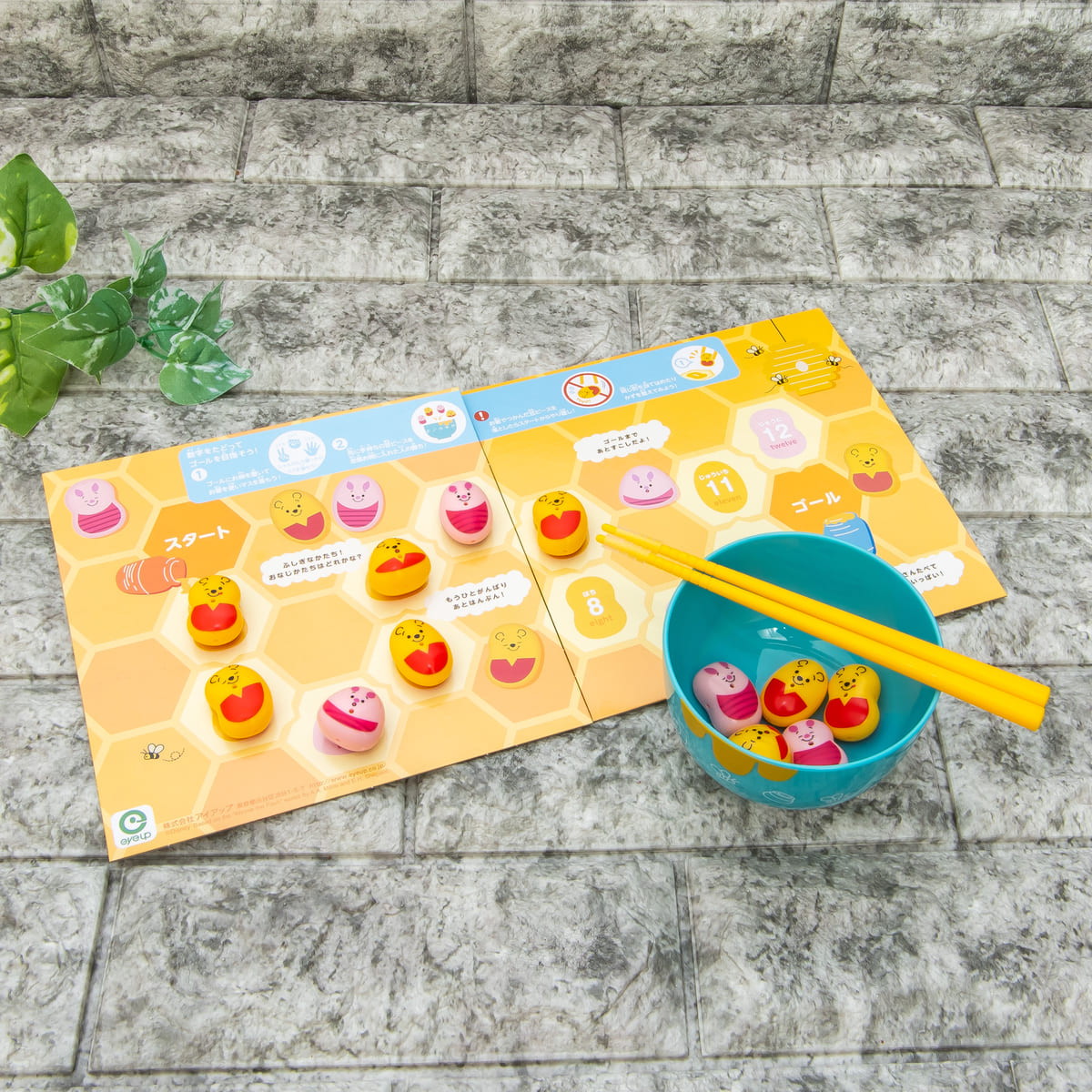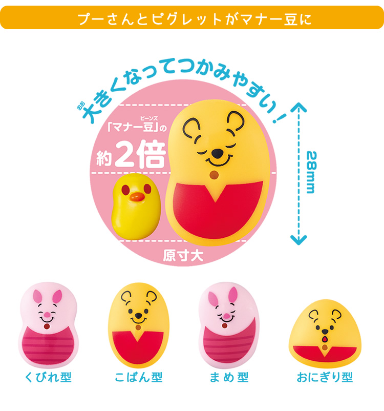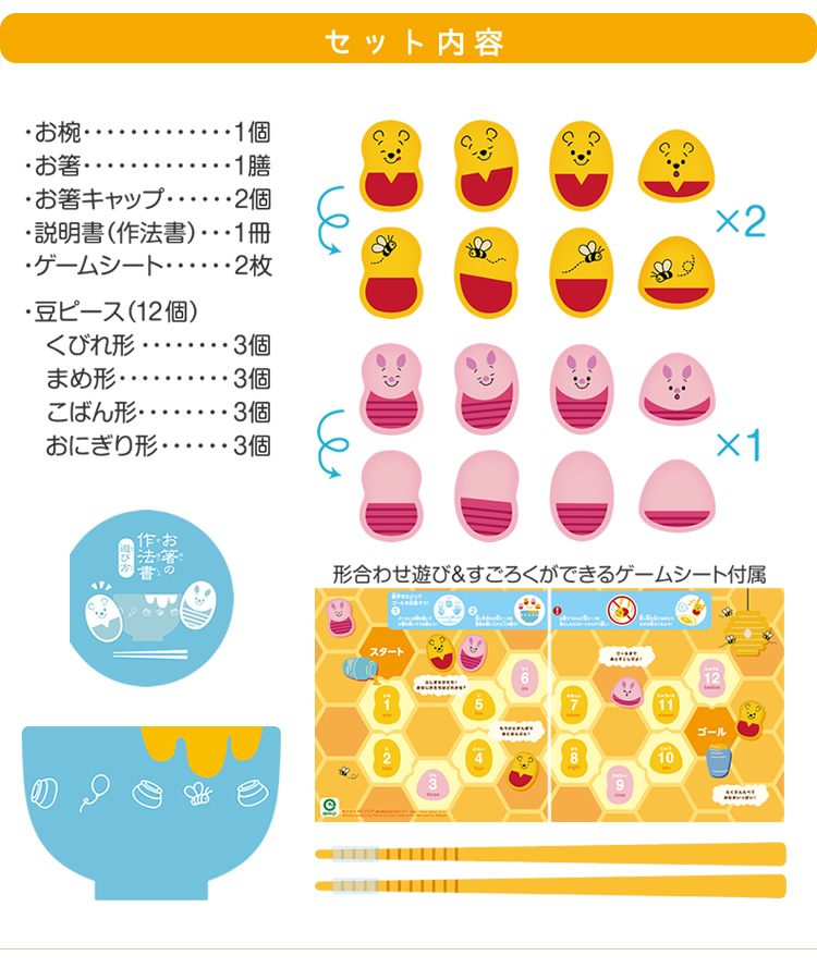 いろいろな表情の「プーさん」、「ピグレット」デザインの豆で、遊びながらお箸のマナーを学べるゲームです。