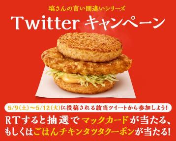 「#塙さんの言い間違いシリーズ」のハッシュタグが付いたキャンペーン対象のツイートを公式リツイートすると、ごはんチキンタツタの割引クーポン、または抽選で合計100名にオリジナルマックカード」1,000円分がプレゼントされます☆