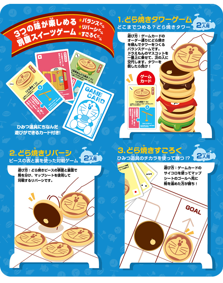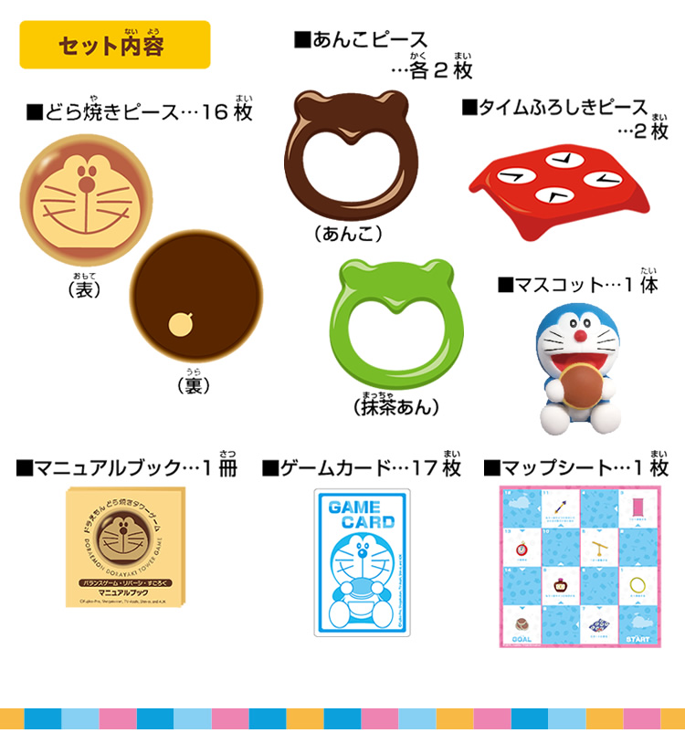 「ドラえもん」の大好物「どら焼き」をモチーフにした「どら焼きピース」を積んで楽しむバランスゲームです。
