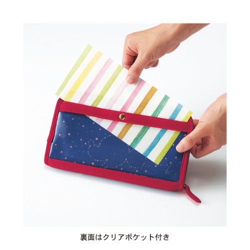 また、裏側にチケット収納に便利なクリアポケット付きで、ファスナーポケットやカード&ペンホルダーも充実しています。