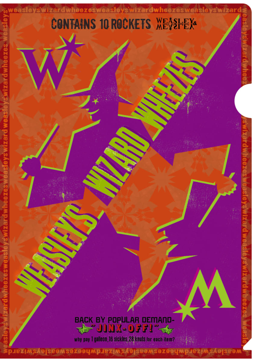 ウィーズリー家の双子の兄弟「フレッド」と「ジョージ」が立ち上げた悪戯専門店「ウィーズリー・ウィザード・ウィーズ」をモチーフにしたクリアファイル。