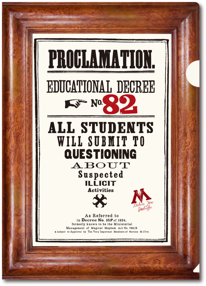 ホグワーツ高等尋問官に就任した「ドローレス・アンブリッジ」の教育令をモチーフにしたデザインのクリアファイル。