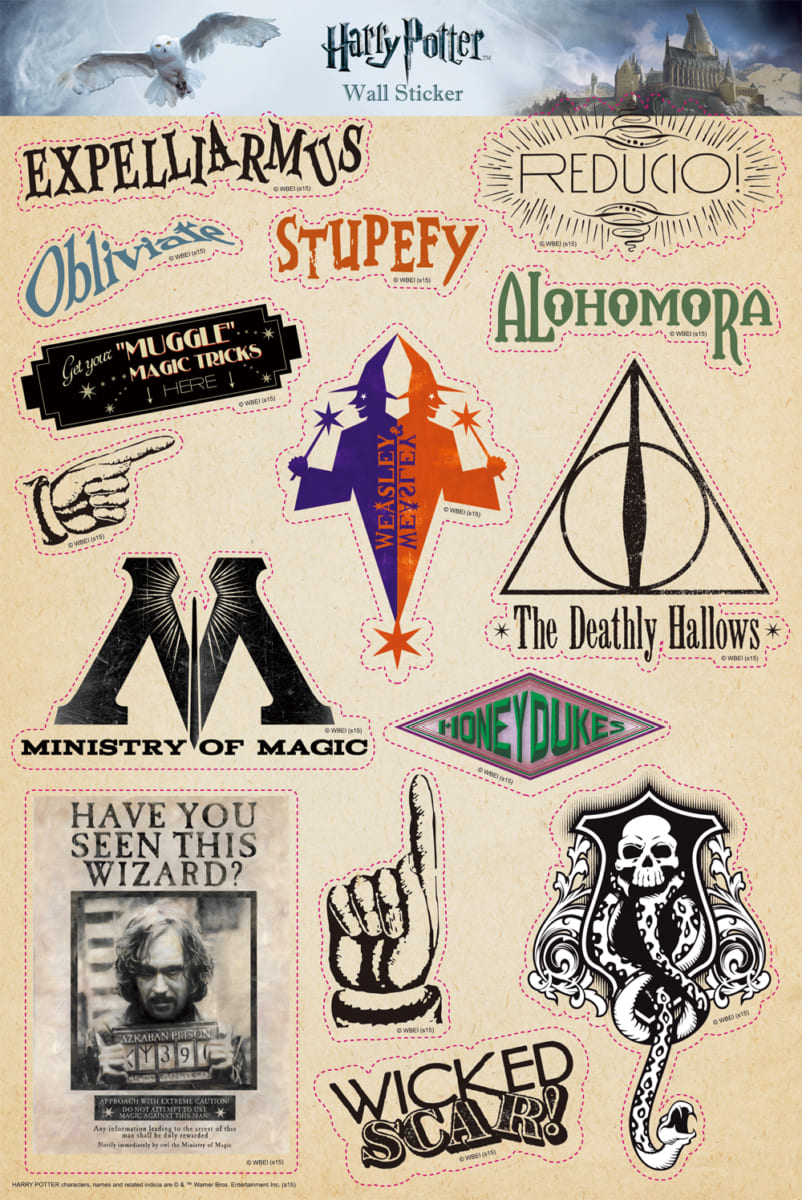 呪文や専門店のロゴ、手配書など、魔法世界に関する様々なデザインのステッカーが揃っています。
