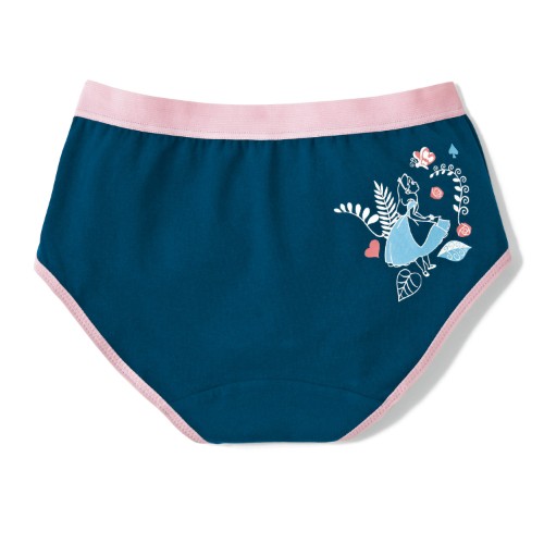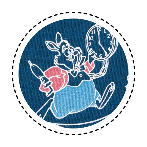 ネイビーのバックスタイルには「バタつきパン蝶」をじっと見つめる「アリス」をプリント。