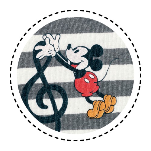 ボーダー柄のフロント部分にはト音記号をキャッチする「ミッキーマウス」