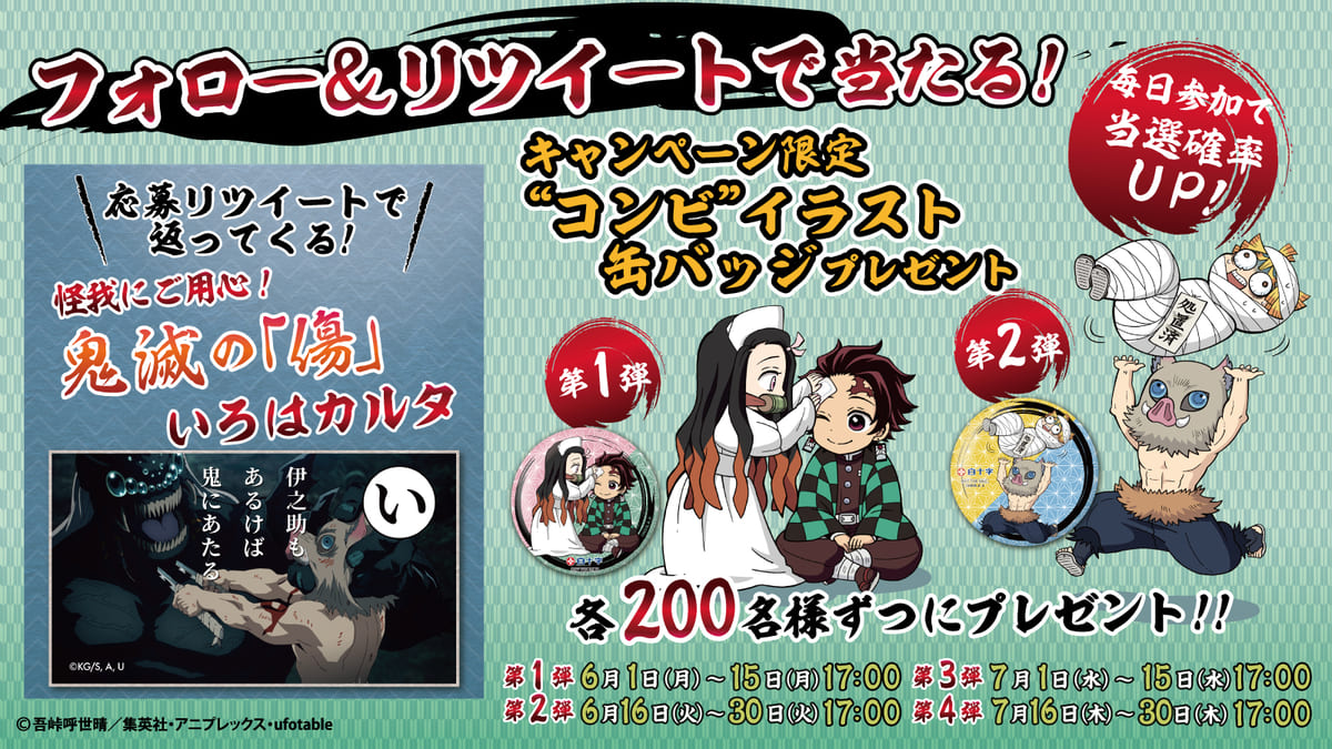 合わせて、フォロー&リツイートで応募ができ、炭治郎が読み上げる「鬼滅の”傷”いろはカルタ」がリプライで返ってくるTwitterでのプレゼント企画も開催されます☆