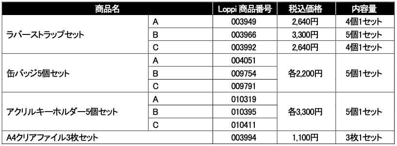 ※店頭では全15種からのランダム形式での販売、Loppi・HMV&BOOKS onlineではA・B・Cの5個セットでの販売となります。