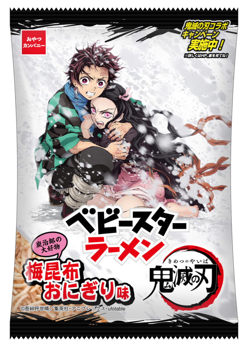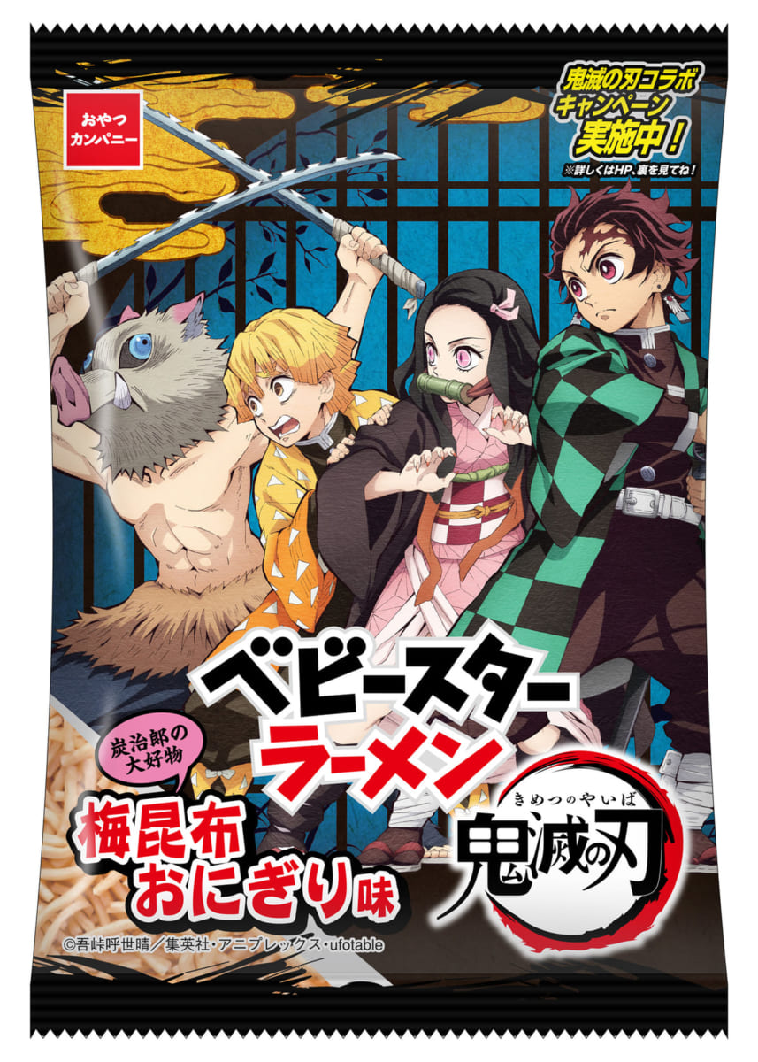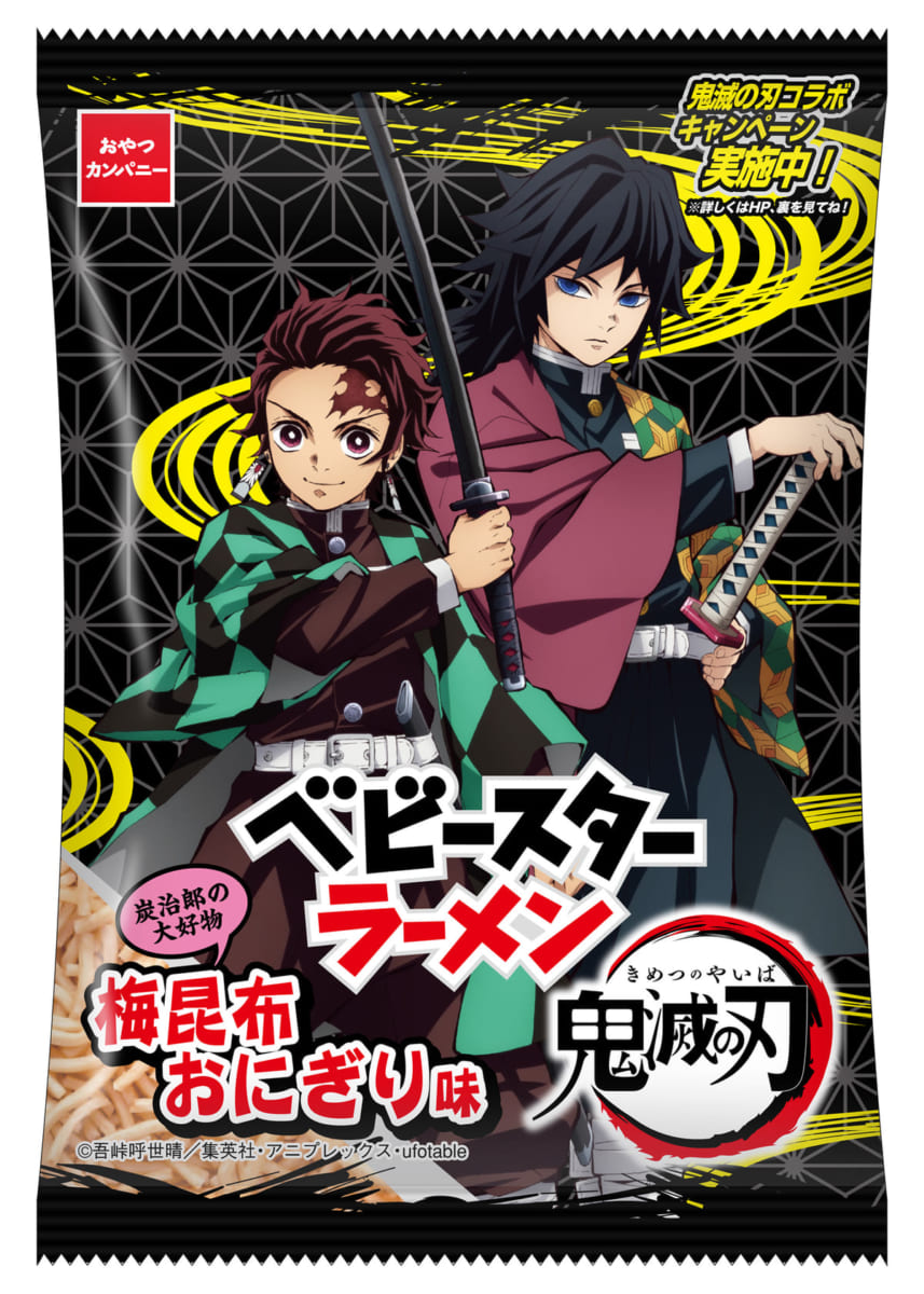 おやつカンパニーの「ベビースターラーメン」とTVアニメ『鬼滅の刃』のコラボ商品「鬼滅の刃 ベビースターラーメン(梅昆布おにぎり味)」が登場しました。