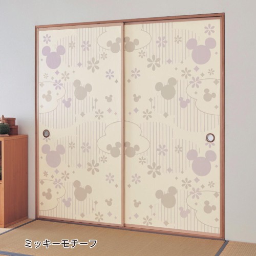 花柄や雲などを散らしたふすま紙に、ミッキーモチーフがたっぷり描かれています。