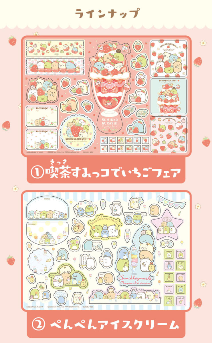 今回は、「喫茶すみっコでいちごフェア」「ぺんぺんアイスクリーム」「おすしの会」「まぁるいきゅうり?み~つけた」の食べ物にまつわるテーマのかわいいシールが盛りだくさんです☆