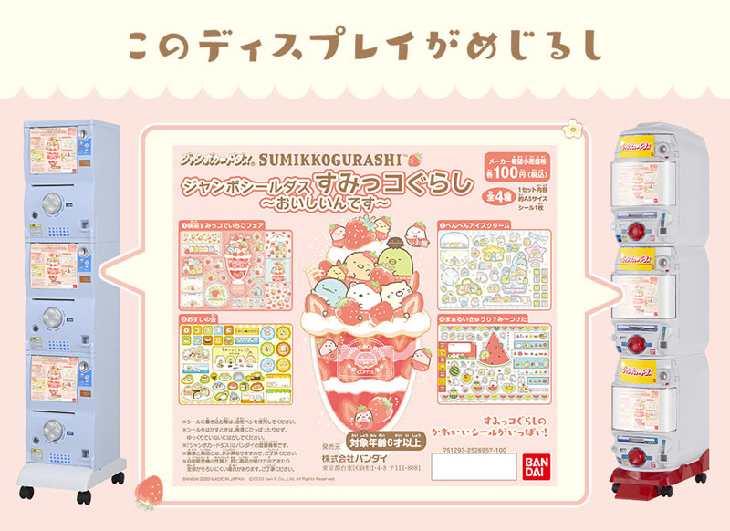 「ジャンボシールダス すみっコぐらし ~おいしいんです~」は、2020年5月中旬から全国の玩具売場などのジャンボカードダス自販機で販売中です。