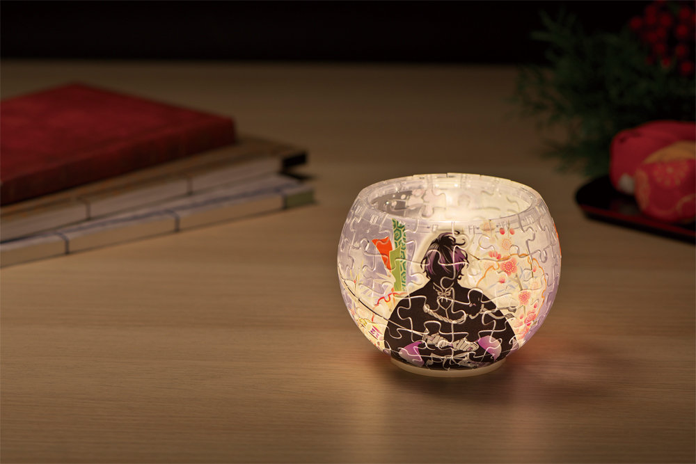 髪の色をイメージした薄紫色を基調とする立体パズルには、梅や竹が配されています。