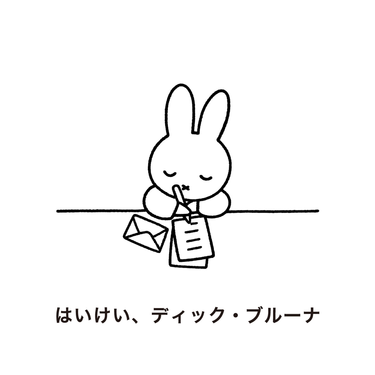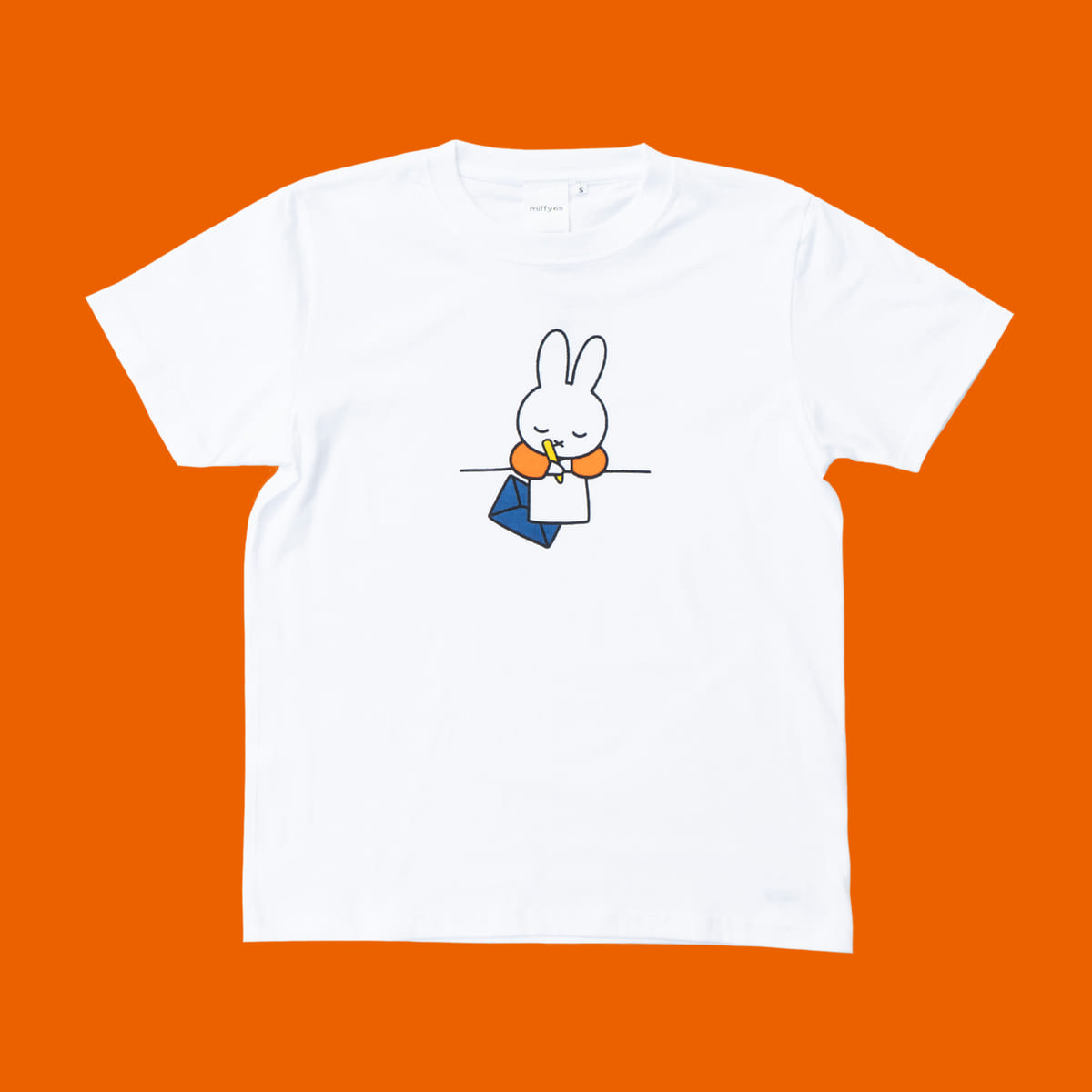 「え」は、絵本『うさこちゃんのてがみ』から「ミッフィー」が手紙を書いているイラストがプリントされたTシャツです。
