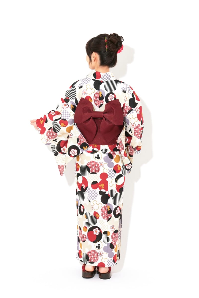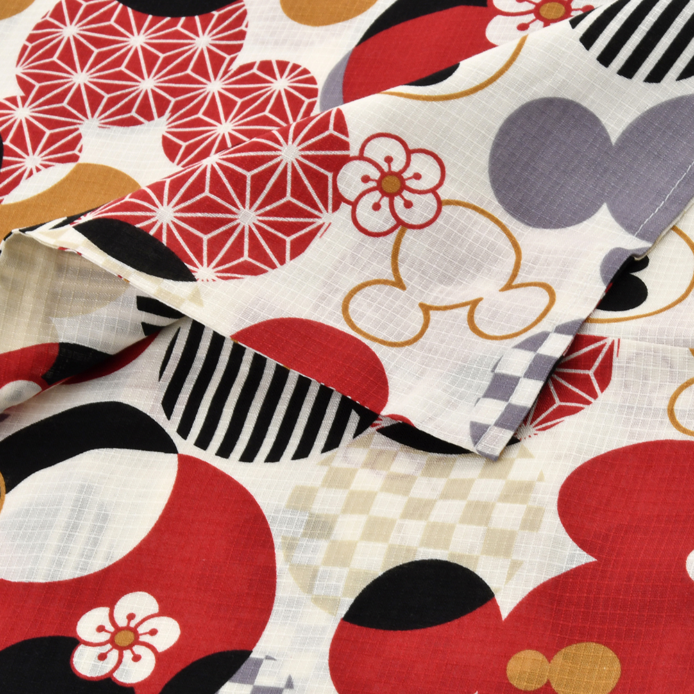 白をベースにした浴衣には麻の葉模様や市松模様、縞模様のミッキーアイコン、梅の花などが散りばめられています。
