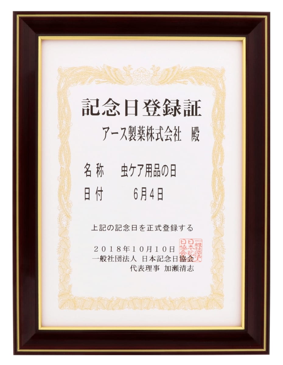 6(ム)月4(シ)日の語呂に合わせて定められた『虫ケア用品の日』は、2018年10月に日本記念日協会からも記念日の登録証が発行されています。