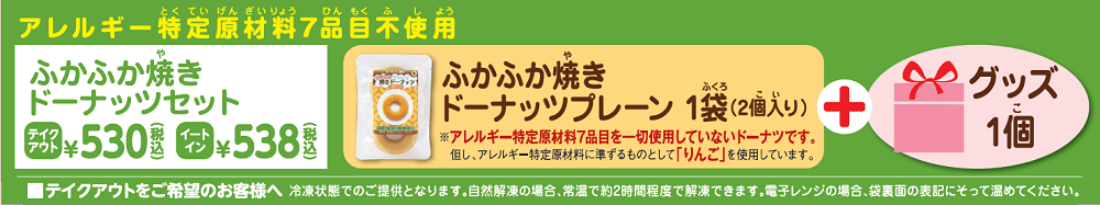 ※ふかふか焼きドーナッツ プレーンは、アレルギー特定原材料7品目を一切使用していないドーナツです。ただし、アレルギー特定原材料に準ずるものとしてりんごが使用されています。