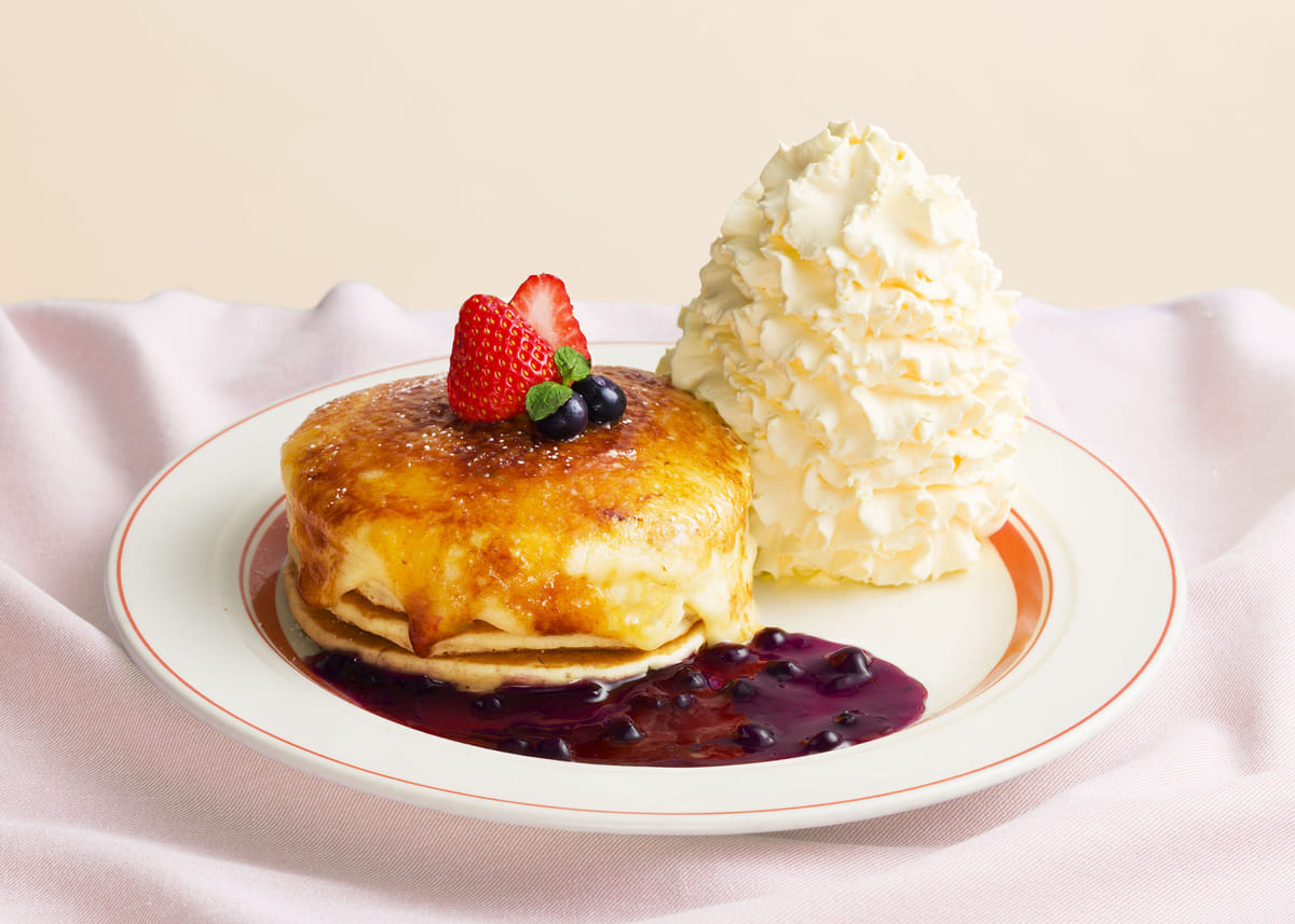 クリームチーズのブリュレパンケーキは、濃厚なチーズクリームと爽やかなブルーベリーソースの組み合わせが堪らない美味しさです☆
