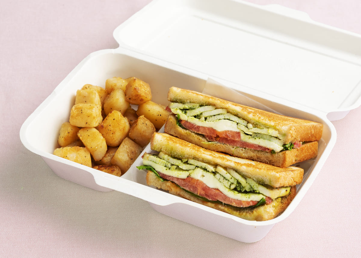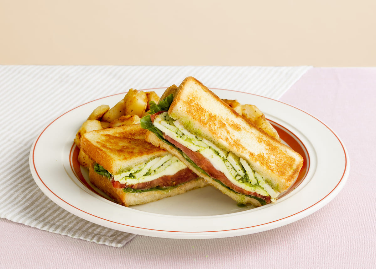 モッツアレラチーズとバジルチキンのホットサンドは、バジルペーストの香りが食欲をそそり、食べ応え満点!