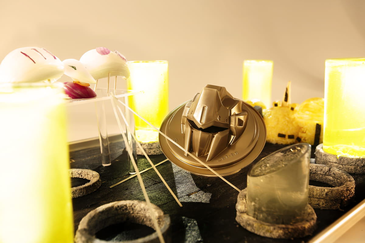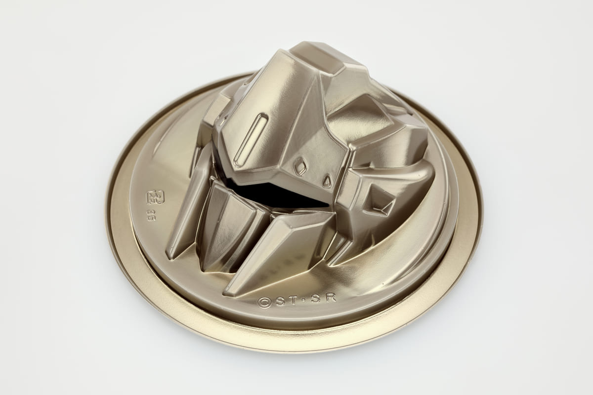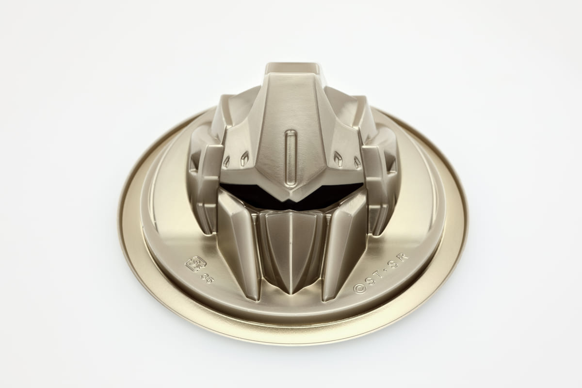モビルスーツ「百式」の頭部を模った金色の容器に入った「百式とうふ」