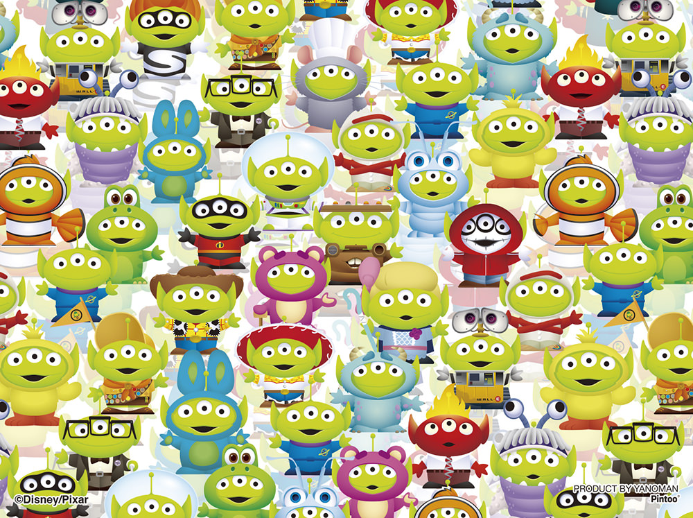ピクサーキャラクターたちのコスチュームを着た「エイリアン」の総柄です。