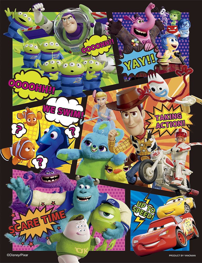 ピクサー作品のキャラクター達がスタイリッシュなコマに大胆に描かれています。