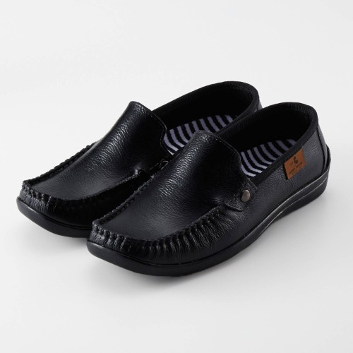 レザー風の表情をもったモカシンデザインのレインシューズ。