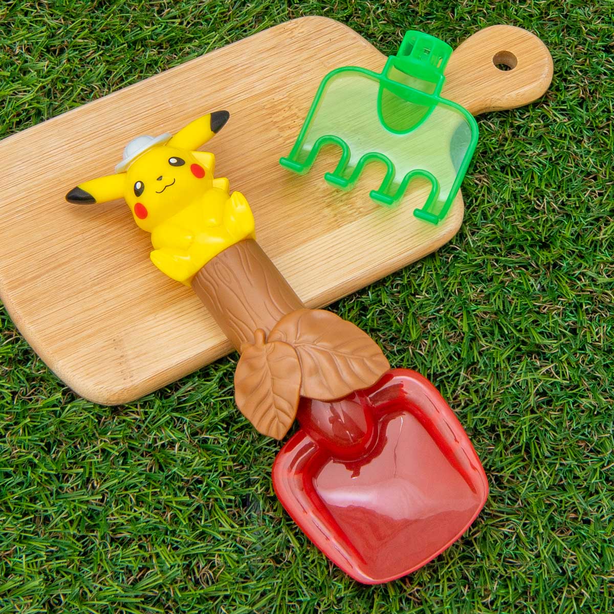 ピカチュウのパーツが取り外せるようになっており、先端にスコップと熊手を付けて遊ぶことができます。